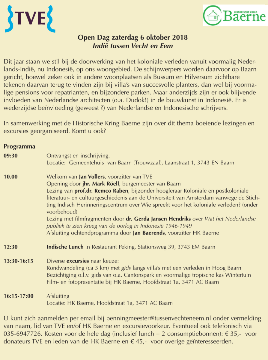 Dit jaar staan we stil bij de doorwerking van het koloniale verleden vanuit voormalig Nederlands-Indië, nu Indonesië, op ons woongebied. De schijnwerpers worden op Baarn gericht, hoewel zeker ook in andere woonplaatsen als Bussum en Hilversum Indische invloeden te vinden zijn bij villa’s van succesvolle planters, bij voormalige pensions voor repatrianten en in bijzondere parken. Anderzijds hebben ook Nederlandse architecten (o.a. Dudok!) de bouwkunst in Indonesië beïnvloed. Nederlandse en Indonesische schrijvers hebben zich laten inspireren door onze koloniale geschiedenis
