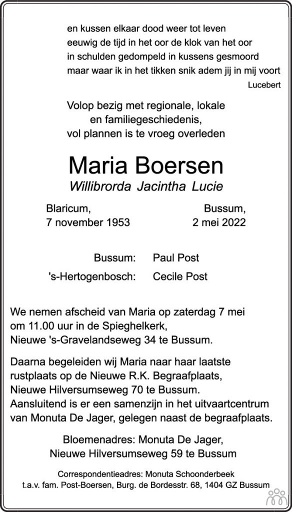 De Stichting Tussen Vecht en Eem geeft met droefheid kennis van het overlijden van ons bestuurs- en redactielid Maria Boersen